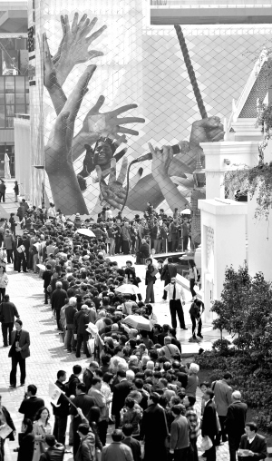 拿到中國館預(yù)約券的游客欣喜,沒拿到的也十分平和。錢先生夫婦9時45分入園時,中國館預(yù)約券已發(fā)放完畢,他們就在亞洲廣場上的預(yù)約機上預(yù)約了主題館的參觀!爸袊^反正是永久性建筑,以后再來看也不遲,”同樣未能拿到預(yù)約券的李先生告訴記者。