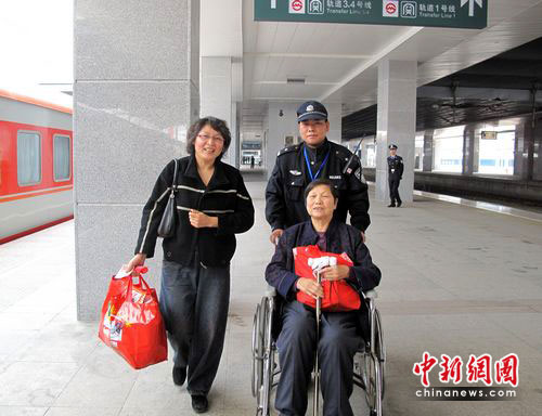 中新網(wǎng)徐州4月24日電 (耿晴 張良燦 侯啟光)“您好,我是上海鐵路民警,請(qǐng)問要到哪去?輪椅我來幫您推! ”在上;疖囌6號(hào)候車室,來自徐州鐵路公安處援滬安保民警邊詢問邊接過一旅客手中的輪椅!奥闊┠鷰兔α耍覌屔眢w不好只能坐輪椅,謝謝!”身后,一位拿著兩個(gè)大包裹的中年女性旅客連連道謝,民警會(huì)同世博志愿者一直將老人送上了列車。