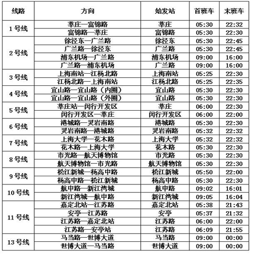軌道交通4、6、7、8、9五條涉博線路在常規(guī)末班車后,將在世博園周邊站點加開加班列車,除重點涉博車站以外,其他途經(jīng)車站只可下客出站,不可進站上客和換乘。加開列車末班車時間為0:10,運營間隔約為15分鐘一班。具體車站的首末班車時間還可查看各車站公告、至上海地鐵官網(wǎng)(/) 進行查詢或撥打地鐵服務(wù)熱線64370000進行詢問。