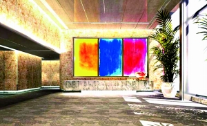 在中國館60.6米層的序廳,作者詩迪創(chuàng)作了紅、黃、藍(lán)三幅色調(diào)的作品《EXPO2010天水無居·五洲同源》。