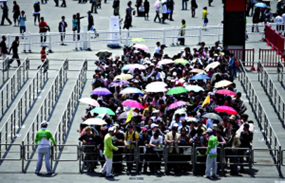昨日的安檢中,很多游客需開包檢查,相機、筆記本電腦需現(xiàn)場開機,延長了安檢時間。安檢人員說,游客可以帶傘遮陽,但最好不要帶防曬霜等化妝品。