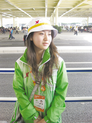 張?bào)蘩霞以诮,是?fù)旦大學(xué)視覺藝術(shù)學(xué)院的大一學(xué)生,標(biāo)準(zhǔn)的90后女孩。通過網(wǎng)上報(bào)名并獲得任用后,她成為了上海世博會(huì)首批志愿者,而如果再細(xì)分則可稱作“高峰期志愿者”!懊刻煸缟7點(diǎn)半不到就得到園區(qū),晚上下班時(shí)間不定,至少10點(diǎn)以后吧!睆?bào)薷嬖V記者,她每天要做的,就是站在這處位于商業(yè)中心最繁華的街角,為任何有需要的游客提供力所能及的幫助。接受采訪時(shí),女孩才正式上崗短短半日,“已經(jīng)為至少20個(gè)游客指路,或是回答他們的一些咨詢。”