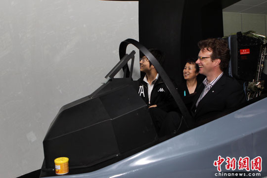 來到大型飛機(jī)模擬機(jī)展區(qū),大山嫻熟地坐進(jìn)駕駛艙體驗(yàn)飛行!澳鞘瞧謻|、這是陸家嘴!彼贿叢倏v模擬機(jī),一邊辨認(rèn)著大屏幕上出現(xiàn)的地面標(biāo)志性建筑物。大山對環(huán)形屏幕中顯示的上海非常熟悉,認(rèn)出了很多地點(diǎn),并笑稱要從世博會(huì)加拿大館上空飛過。走下駕駛艙,大山幽默地稱自己有點(diǎn)快學(xué)會(huì)開飛機(jī)了。