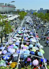 當記者沿著世博軸緩步來到博成路高架步道下方的沙特館排隊區(qū)域入口時,時間已是9:25。入口處的沙特館工作人員手上的告示牌已經(jīng)寫著“沙特館排隊時間約8小時”,不少游客看到標示后就放棄了排隊,但更多的游客選擇繼續(xù)堅持。已經(jīng)73歲的付老先生說:“之前就選定傳聞中很好看,但排隊時間長的沙特館作為世博游第一站,下定決心要把最難排到的場館先看掉。”老人事前已準備好遮陽帽、攜帶式小椅、食物和水等物品,即使真要排9小時也要堅持下去。