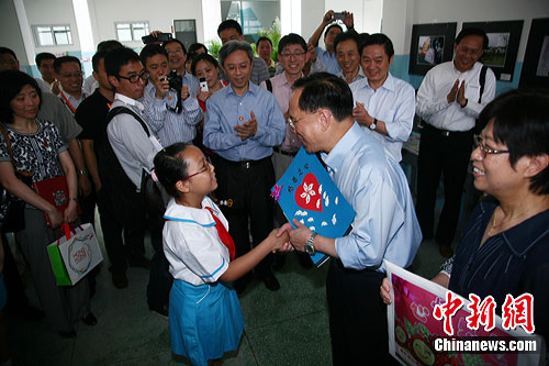 曾蔭權(quán)在四川省委書記劉奇葆的陪同下先后參觀了東方汽輪機有限公司新基地、東汽醫(yī)院、康復(fù)及假肢中心,以及德陽市第一小學。他仔細問詢因地震致殘病人的恢復(fù)情況,與小學生親切合影。