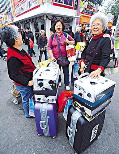 來自廣州的楊小姐和潘婆婆,每年工展會都會專程來港購物。兩人不消五分鐘,便各買一個價值近二千元的煲,個半小時內(nèi)兩人消費逾萬元,現(xiàn)金不夠也毋須怕,“刷卡啦!”