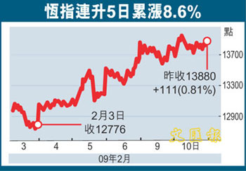 中新網(wǎng)2月11日電 據(jù)香港《文匯報》報道,港股連升5天,合計共升約1100點,恒指10日收報13880點,升111點,成交421億。內(nèi)地傳出振興石化行業(yè)計劃,包括提高暴利稅起征點,石油股上升,加上內(nèi)地股市升勢強勁,有證券界人士認為市場在觀望美國通過救市方案后,恒指短期內(nèi)有機會上試14000點。
