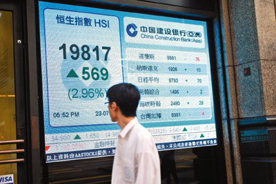 恒指23日高開(kāi)184點(diǎn),下午升幅更強(qiáng),升至接近20000點(diǎn)水平,收?qǐng)?bào)19817.6點(diǎn),是去年10個(gè)月以來(lái)的高位,全日升569點(diǎn),升幅近3%,成交744億。