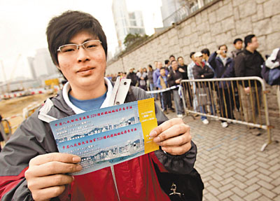 解放軍駐港部隊(duì)13日晨8時(shí)半起,在中環(huán)及槍會(huì)山兩個(gè)軍營門外派發(fā)參觀兩艘導(dǎo)彈護(hù)衛(wèi)艦的入場券,每人可憑身份證領(lǐng)取最多2張入場券。在中環(huán)軍營門外,未正式派發(fā)已有數(shù)百名市民在門外守候,排頭位的鄒先生更在12日晚10時(shí)開始便已通宵輪候。有市民在領(lǐng)取2張入場券后,即到“龍尾”再次排隊(duì)領(lǐng)取,希望可與更多親朋好友一同參觀戰(zhàn)艦。
