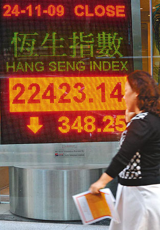 港股24日出現(xiàn)戲劇性變化,上午還保持平穩(wěn),午后內(nèi)地股市突然插水,拖累港股下午急轉(zhuǎn)直下,午后開市即挫200點,其后更一度急挫376點,曾失守22400點,全日收報22423點,跌348點,跌幅1.5%,全數(shù)抵銷了周一的升幅,成交額增加至674.6億元。期指臨近結(jié)算,轉(zhuǎn)倉活動也非活躍,期指收報22472點,高水49點,成交合約高達(dá)13.5萬張。