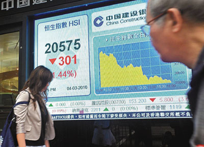 在“兩會因素”刺激下,恒指4日高開107點(diǎn),一度逼近21000點(diǎn)關(guān)口。但午后內(nèi)地有消息稱中央將嚴(yán)查金融機(jī)構(gòu)貸款流入股市,引發(fā)內(nèi)地股市出現(xiàn)拋售潮。港股也被波及,中行、工行和建行分別跌3.47%、2.54%和2.93%,收報3.89元、5.75元和5.96元,單是上述三大行已拖累大市下跌過百點(diǎn)。重磅股中移動跌2.41%收報72.85元,匯控跌0.49%報81.05元。