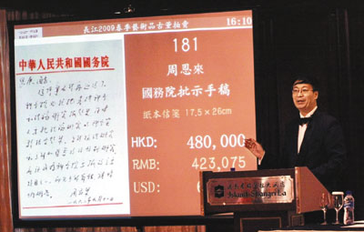 中新網(wǎng)5月25日電 據(jù)香港《文匯報》報道,長江2009春季藝術(shù)品、古董拍賣會24日首次在香港展開,近400件珍品成功售出,總成交額高達1.3億元。拍賣品中包括珍貴的已故國務(wù)院總理周恩來親手批核的國務(wù)院批示手稿,24日以48萬元高價成交。