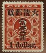 這枚紅色印花郵票是清朝人用作繳交關(guān)稅的三分稅票,但國家郵政成立初期未有足夠郵票使用,在稅票蓋上一元,當(dāng)作郵票。