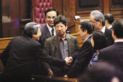 香港金融界的李國(guó)寶、專(zhuān)業(yè)會(huì)議的梁美芬、商界的黃宜弘、工業(yè)界的林大輝等立法會(huì)議員,在特首宣讀施政報(bào)告前,都爭(zhēng)相上前與其握手問(wèn)好,歷時(shí)至少5分鐘,不知期間有否談及其因“小病是福”,民望反而急升的事宜。