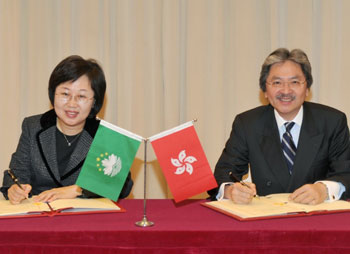 24日,香港財(cái)政司司長(zhǎng)曾俊華及澳門政法務(wù)司司長(zhǎng)陳麗敏在香港簽署了《中華人民共和國(guó)香港特別行政區(qū)政府與中華人民共和國(guó)澳門特別行政區(qū)政府關(guān)于持永久性居民身份證入出境及互免填報(bào)入出境申報(bào)表協(xié)議》。這標(biāo)志港澳兩地在出入境事務(wù)方面的合作進(jìn)入新的階段。