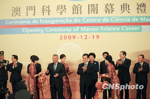 中新社澳門十二月十九日電 (記者 路梅)中國(guó)國(guó)家主席胡錦濤十九日下午來(lái)到位于澳門半島東南部的澳門科學(xué)館,出席澳門科學(xué)館開(kāi)幕典禮,該館投資逾三點(diǎn)三七億澳門元,經(jīng)三年多時(shí)間興建而成,是澳門首個(gè)科普教育公共設(shè)施。(完)
