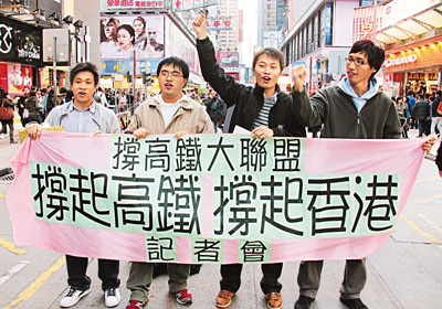 社交網(wǎng)站近日有人組成“撐起高鐵,撐起香港”群組,并已有逾萬名支持者。一群生于上世紀(jì)70及80年代的人士更組成“撐高鐵大聯(lián)盟”,上周成立“集會(huì)支持西九起高鐵”群組,目前已有逾1100名支持者。4名聯(lián)盟成員13日在旺角街頭,呼吁其他高鐵支持者本周五往立法會(huì)門外靜坐,以示“撐高鐵”的決心。
