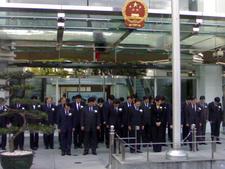 早上9時(shí)許,行政長(zhǎng)官曾蔭權(quán)率領(lǐng)一眾官員,包括政務(wù)司司長(zhǎng)唐英年、財(cái)政司司長(zhǎng)曾俊華、律政司司長(zhǎng)黃仁龍,以及一眾司局長(zhǎng)及其它官員,在政府總部廣場(chǎng)外,默哀1分鐘,以悼念青海地震遇難同胞。