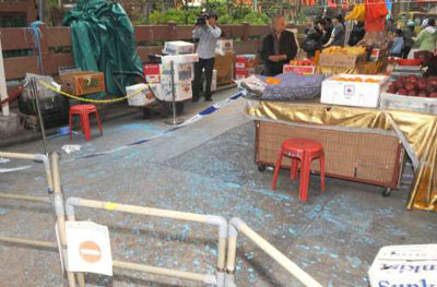 中新網(wǎng)3月15日電 據(jù)香港《大公報(bào)》報(bào)道,香港柴灣道一間水果攤因拒交“陀地”費(fèi)5年來(lái)頻被黑幫滋擾,患癌店?yáng)|受刺激致病情惡化去世,遺孀和兩子接手后滋擾仍未間斷,14日晨店鋪開(kāi)業(yè)時(shí),被兩名惡漢突然走近潑淋藍(lán)色油漆,少東走避不及輕微濺中,另一名街坊婆婆經(jīng)過(guò)也中招,幸有驚無(wú)險(xiǎn)。