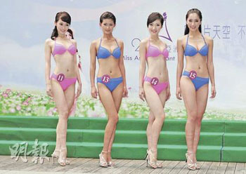 中新網10月15日電 據香港《文匯報》報道,2009年亞洲小姐選舉候選佳麗14日在香港荃灣一間酒店以泳裝在池畔與傳媒見面,但2號王,幓忌蠚夤苎兹毕挥18位佳麗亮相。大會安排佳麗穿上比基尼泳裝,各佳麗身裁都顯得突出。