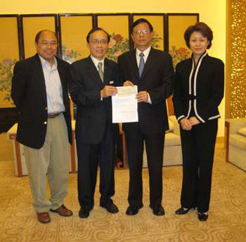 圖:晶苑集團主席羅樂風(左二)向中聯(lián)辦賑災(zāi)專戶捐款港幣105萬元,中聯(lián)辦副主任鄭坤生(右二)代為接受。(圖片來源:大公報)
