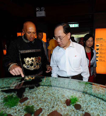 曾蔭權(quán)還到了“金魚(yú)寶典”一睹全球最大的黑獅頭金魚(yú),他在金魚(yú)愿望樹(shù)上寫(xiě)上愿望,意指海洋公園全球第一。