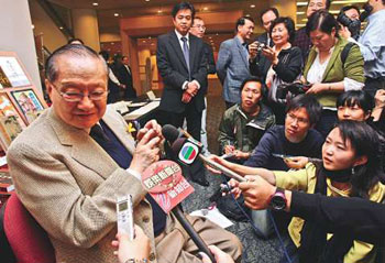 二月十六日,為緬懷上月底病逝的武俠小說宗師梁羽生,《大公報(bào)》和天地圖書在香港中央圖書館舉辦座談會(huì)。著名武俠小說作家金庸就梁羽生在當(dāng)代文學(xué)、詩詞、楹聯(lián)等方面的造詣和成就以及生平逸事趣聞,與其著作愛好者和公眾座談分享。 中新社發(fā) 張勤 攝