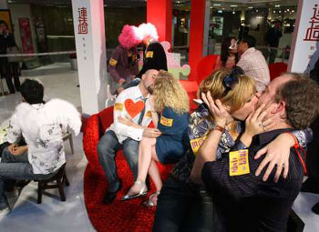 在鎂光燈的閃爍下,五對(duì)來自不同國家的情侶,坐上獨(dú)特的“愛情連椅”,他們要在眾目睽睽下,用各異的方式吻自己的愛侶,持續(xù)2分14秒。圍觀市民大感興趣,摒住呼吸觀賞現(xiàn)場(chǎng)的熱吻。