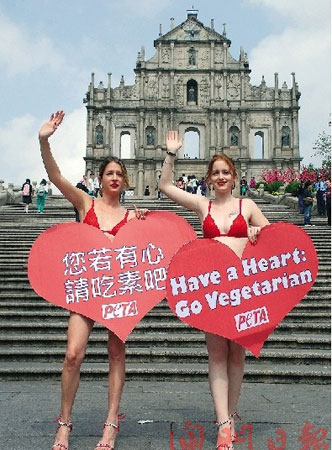兩名性感內衣女郎12日中午12時現(xiàn)身旅游旺區(qū)——大三巴牌坊,兩人手持心形的“您若有心,請吃素吧”標語。兩人是善待動物組織成員,來到澳門主要傳遞“素食對身心均有益處”和“吃素是對我們自己、動物及地球最好的情人節(jié)禮物”等訊息。