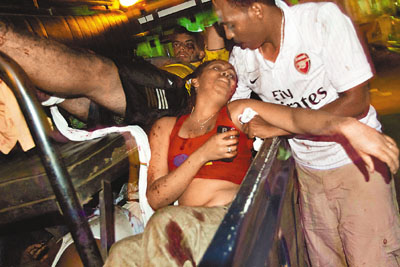 20分鐘后,坎帕拉城東一家欖球會再發(fā)生爆炸,造成逾百死傷。目擊者稱,當時約數(shù)百名球迷正在大屏幕前觀賽,下半場完場前3分鐘左右,屏幕前突然“砰”一聲爆炸。
