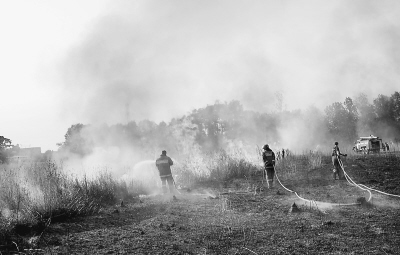 波塔波夫的話很快得到了驗(yàn)證。就在記者返回途中,距莫斯科大約15公里處,路邊一個(gè)加油站附近起火。這個(gè)加油站南側(cè)有一道大約10米寬的隔離帶,再往外則是一個(gè)比足球場(chǎng)還大的草場(chǎng),草場(chǎng)的東、西、南三面是森林。記者看到,100多米長(zhǎng)的火龍借著風(fēng)力向加油站方向翻滾而來(lái)。過(guò)火之處,留下黑乎乎的灰燼。加油站的職工用提水桶和臉盆盛著水往草場(chǎng)飛奔。