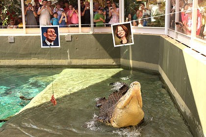 鱷魚哈里在兩張掛有等重雞肉的照片間做出選擇,照片上分別是執(zhí)政的工黨黨魁吉拉德和反對黨聯(lián)盟候選人艾伯特的頭像。