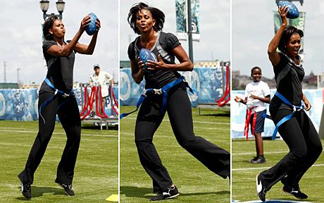 現(xiàn)在,這位備受關(guān)注的第一夫人又以身作則,她加入到由印第安納波利斯小馬隊(duì)教練托尼·唐奇、前坦帕灣海盜隊(duì)線衛(wèi)德里克·布魯克斯等橄欖球明星發(fā)起的旨在倡導(dǎo)青少年健康生活的美式橄欖球運(yùn)動(dòng),在學(xué)生們面前大展她運(yùn)動(dòng)的天賦。