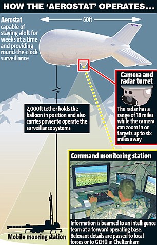 據(jù)報(bào)道,這種長約60英尺(約合18.3米)的氣球造價(jià)每個(gè)約為500萬英鎊,被駐阿富汗英國軍隊(duì)放置在高2000英尺(約合610米)的空中,下面栓著鋼鐵纜繩,將氣球固定住,同時(shí)通過纜繩將信號(hào)傳遞到電子基站。這種裝置能夠非常有效地偵測(cè)塔利班武裝分子的行蹤。