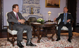 據(jù)報道,會談一開始,施瓦辛格回憶了梅德韋杰夫今年夏天訪問加利福尼亞時的情景。他對梅德韋杰夫說:“我當(dāng)時對您說,‘我會回(俄羅斯)去的’。這不回來了嗎?”施瓦辛格補(bǔ)充說,他帶來了一個大型美國企業(yè)家代表團(tuán)。