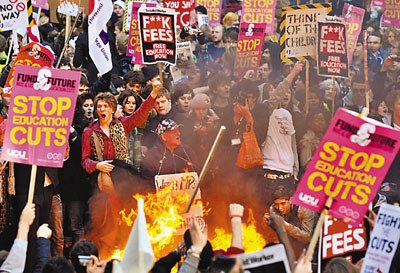 英國首相卡梅倫半年前上任時(shí),曾許諾開辟“共識(shí)政治”的新紀(jì)元,但一場(chǎng)學(xué)生暴力示威標(biāo)志著英國聯(lián)盟政府“共識(shí)期”的結(jié)束。這也是20年來最暴力的街頭示威活動(dòng)。據(jù)報(bào)道,部分示威者輕易突破警方防線,沖進(jìn)6層高的總部大樓,擊破接待處的玻璃墻,肆意毀壞大堂家具,用噴漆寫上“保守黨廢物”等字句。有人直奔頂樓,從高處向地面人群擲下滅火器、水瓶等。