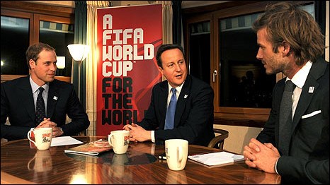 卡梅倫是英格蘭申辦2018世界杯的30人代表團(tuán)中的一員。另外,威廉王子和前英格蘭男子足球隊(duì)長(zhǎng)貝克漢姆也在代表團(tuán)之列。