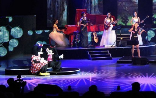 據(jù)報(bào)道,牡丹峰樂(lè)團(tuán)由金正恩親自組建,他觀(guān)看的這次演出包括美國(guó)迪士尼系列的歌舞劇。表演者打扮成米老鼠,小熊維尼等迪士尼知名卡通形象在舞臺(tái)上進(jìn)行表演,同時(shí)巨大背景屏幕上播放著“白雪公主”、“美女與野獸”等迪士尼電影片段。