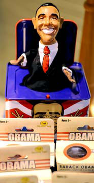 自當(dāng)選總統(tǒng)的那一刻起,奧巴馬就成了商家的“搖錢(qián)樹(shù)”。隨著支持他的呼聲越來(lái)越高,各種以他為原型的商品層出不窮。T恤、籃球、棒球帽、戒指、鑰匙扣、筆、杯子應(yīng)有盡有。在大街小巷,隨處可以看到和奧巴馬有關(guān)的小物品,諸如香煙、拳擊短褲、熱狗、高爾夫球、唇膏、腕表等,各色各樣,琳瑯滿(mǎn)目。