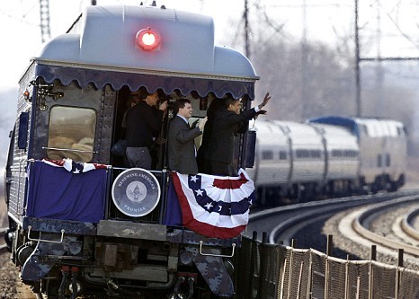 奧巴馬在乘坐專(zhuān)列由費(fèi)城啟程前往首都華盛頓途中,開(kāi)始總統(tǒng)就職的一系列活動(dòng)。當(dāng)天也是其妻子米歇爾45歲的生日,他們?cè)诨疖?chē)上慶祝,兩人沿途又向群眾揮手,很多人夾道歡呼,有人舉起寫(xiě)上“米歇爾生日快樂(lè)”的標(biāo)語(yǔ)牌。