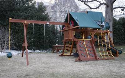 這套木制滑梯、秋千及攀爬套裝,是由美國紅木及香柏木所制,由南達科他州一間公司制造,符合奧巴馬推動的環(huán)保政策原則。暫時未悉這個迷你游樂場花了多少錢建造。