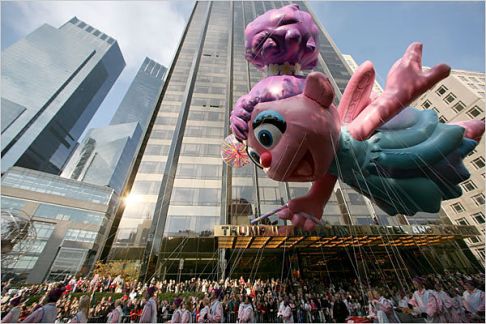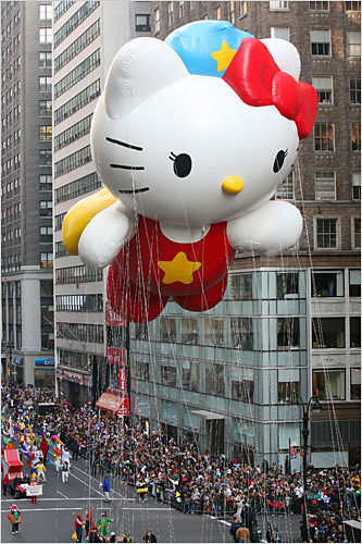 今年有11個(gè)大氣球加入游行,其中包括在天上飄的凱蒂貓(見圖),吸引現(xiàn)場所有人的目光,多達(dá)800名小丑和11支樂隊(duì),以及2000名拉拉隊(duì)員和舞者,將整個(gè)游行氣氛推向高潮。 一位紐約市民幽默的說:“我喜歡的是最后會(huì)出現(xiàn)的耶誕老人,因?yàn)檫@樣我們可以趕快離開,然后回家開始吃火雞!”