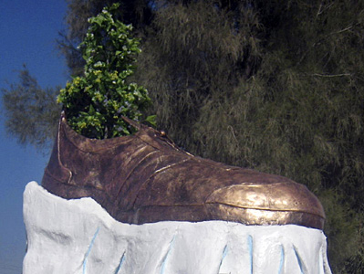 據(jù)香港東方日報即時新聞消息,巨鞋雕像豎立在被處決前伊拉克獨(dú)裁者薩達(dá)姆的家鄉(xiāng)提克里特,雕像種植了1株3米高的大樹,并坐落在1個白色的底座。