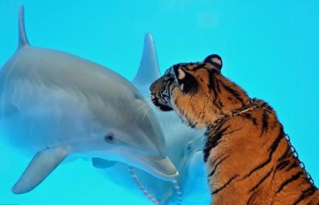 中新網(wǎng)3月7日電 據(jù)英國《每日郵報(bào)》報(bào)道,當(dāng)海豚遇上老虎?這樣的相遇似乎很少見,但是在美國加利福尼亞六旗探索王國游樂園,一只寬吻海豚竟然和一只孟加拉老虎一見傾心,海豚還以吐泡泡的方式向小虎問好。