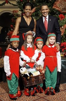 奧巴馬夫婦13日在圣誕晚會上開心地和小精靈們一一握手合照,美國總統(tǒng)夫人米歇爾還會在拍照時,要大家“看著所有的閃光燈,給攝影師一個笑容”,并且指導小朋友如何擺出一個完美的笑容。