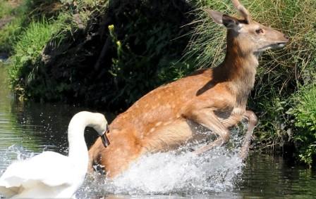 一只年幼的小鹿冒險在倫敦的Richmond公園里想小浸鹿蹄,不幸地是,該地盤內(nèi)的主人天鵝卻并不想和小鹿分享這一湖水,立刻對準小鹿的耳朵猛啄,用力捍衛(wèi)自己的領土。盡管小鹿在體形上占據(jù)優(yōu)勢,但是小鹿最終還是不敵兇悍的天鵝,落慌而逃。