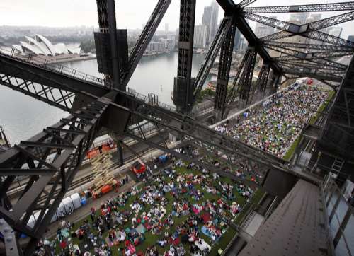 據(jù)香港大公網(wǎng)報(bào)道,當(dāng)?shù)谝豢|陽光照射在悉尼港大橋上時(shí),等待已久的人們井然有序地開始從北岸上橋。他們有的全家出動(dòng),有的呼朋結(jié)伴,有的老人甚至坐著輪椅趕來。在大橋的入口處,一些音樂家在演奏,為早餐會(huì)助興。組織者還特地從農(nóng)場(chǎng)運(yùn)過來十多頭奶牛,為來賓現(xiàn)場(chǎng)擠牛奶。
