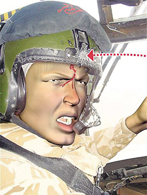 當時塔利班分子的攻勢很激烈,直升機盤旋良久才逮到一個交火較少的機會降落下來,不過當傷員陸續(xù)登上直升機時,對手的襲擊又開始活躍起來。當傷員接載完畢,伊恩冒著彈雨再起飛時,一粒子彈剛巧擊中他的頭盔前部一塊用于安裝夜視鏡的金屬架,子彈從這里穿透了頭盔,射中他的眉心。鮮血從伊恩的額頭涌了出來,一直流到他的眼睛。此時更多的子彈射了進來,支奴干的控制臺被擊中,穩(wěn)定系統無法工作。但伊恩仍然努力控制直升機,繼續(xù)飛行了大約8分鐘,順利降落基地?哲娤⑷耸空f,如果子彈射低一毫米,又欠缺這位機師的駕駛技術,機上所有人相信無機會生還。