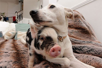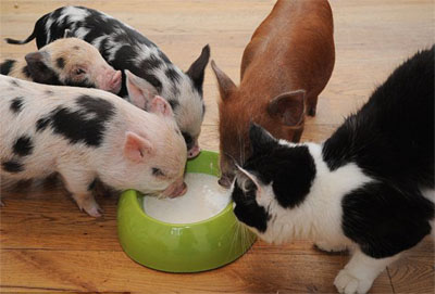 克羅夫特家的寵物“長(zhǎng)老”是狗狗黛西和貓咪?送,這一狗一貓都不是吝嗇的小動(dòng)物,它們?cè)敢夂兔阅阖i們分享自己的一切,包括床和食物。因此常?梢娦∝i們和貓咪躺在一起睡覺、一起喝牛奶;或是看到小豬黏在狗兒黛西身上,相互依偎。有時(shí)候好幾只豬集體霸占黛西的睡床,它寧愿看著小豬熟睡,自己卻坐得直挺挺地,不敢吵醒它們。