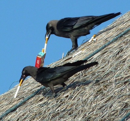 令人詫異的是,這只烏鴉頗為熟練的從煙盒中叼出一根香煙,站在屋頂?shù)囊唤羌?xì)細(xì)“品味”,狀態(tài)十分滑稽。而它的一只同伴見狀也做出了幾乎同樣的行動。